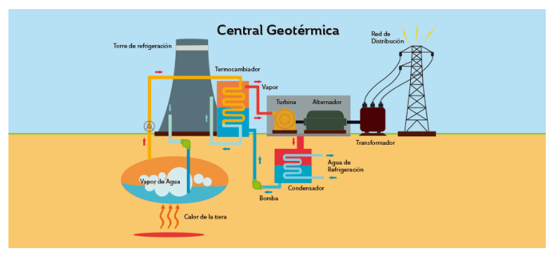 - El vapor de agua hace girar a la turbina, con ello la energía geotérmica se transforma en energía cinética de rotación.